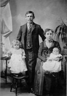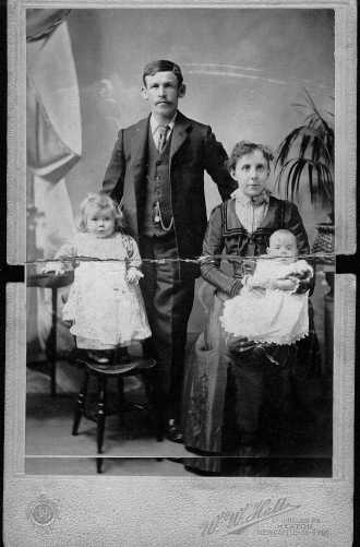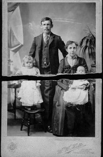 From a tin box, my aunt produced an old family photograph of her and her brother, father and mother. (My auunt being the worried looking little girl on the left). I dated the picture as having been taken soon after the birth of her brother - about 1901. Somewhere in it's history the picture had been bent and had snapped in half. Using a ruler to line up the edges, I scanned the two halves and the result is shown below at 50% of it's original size: